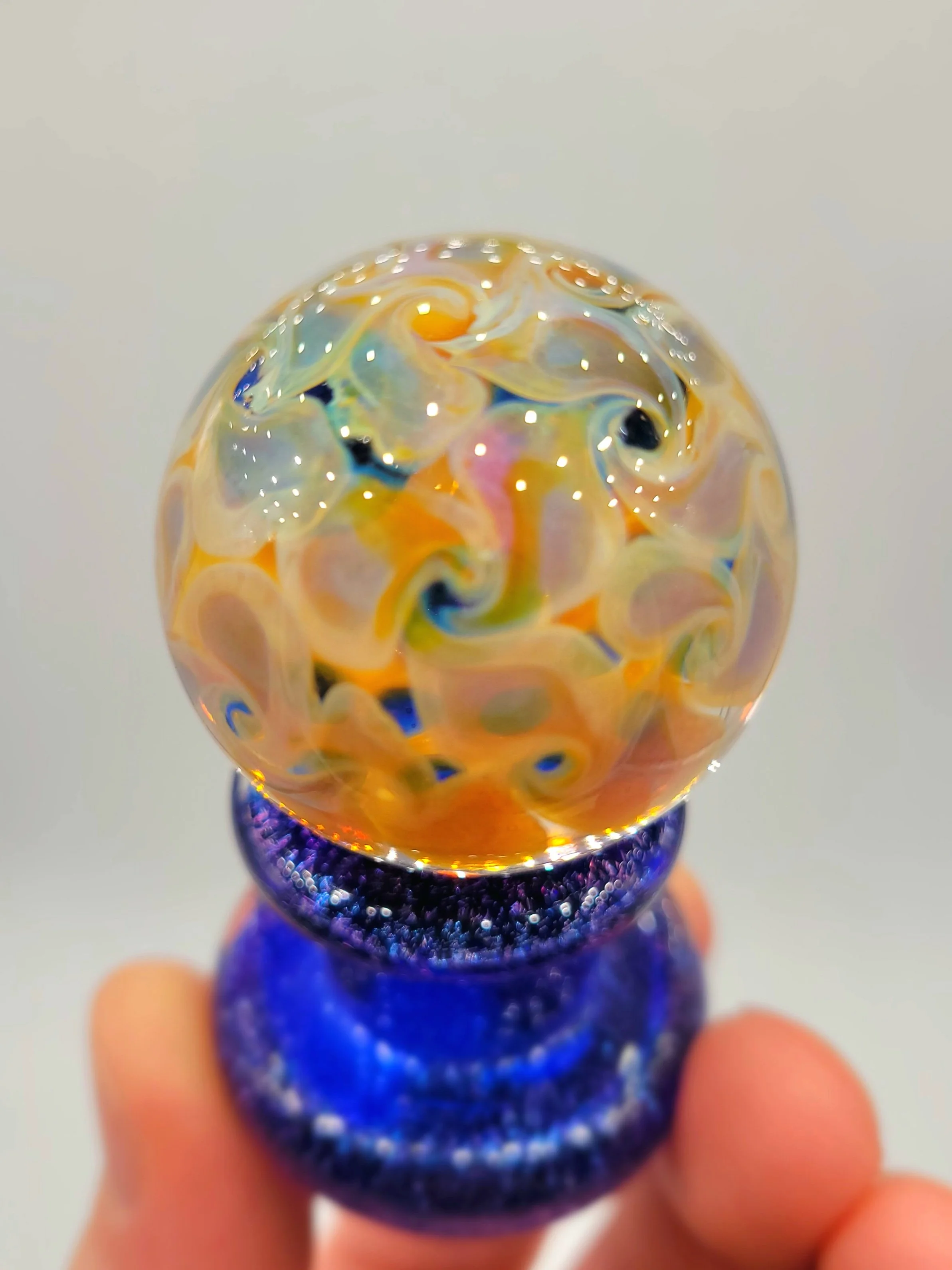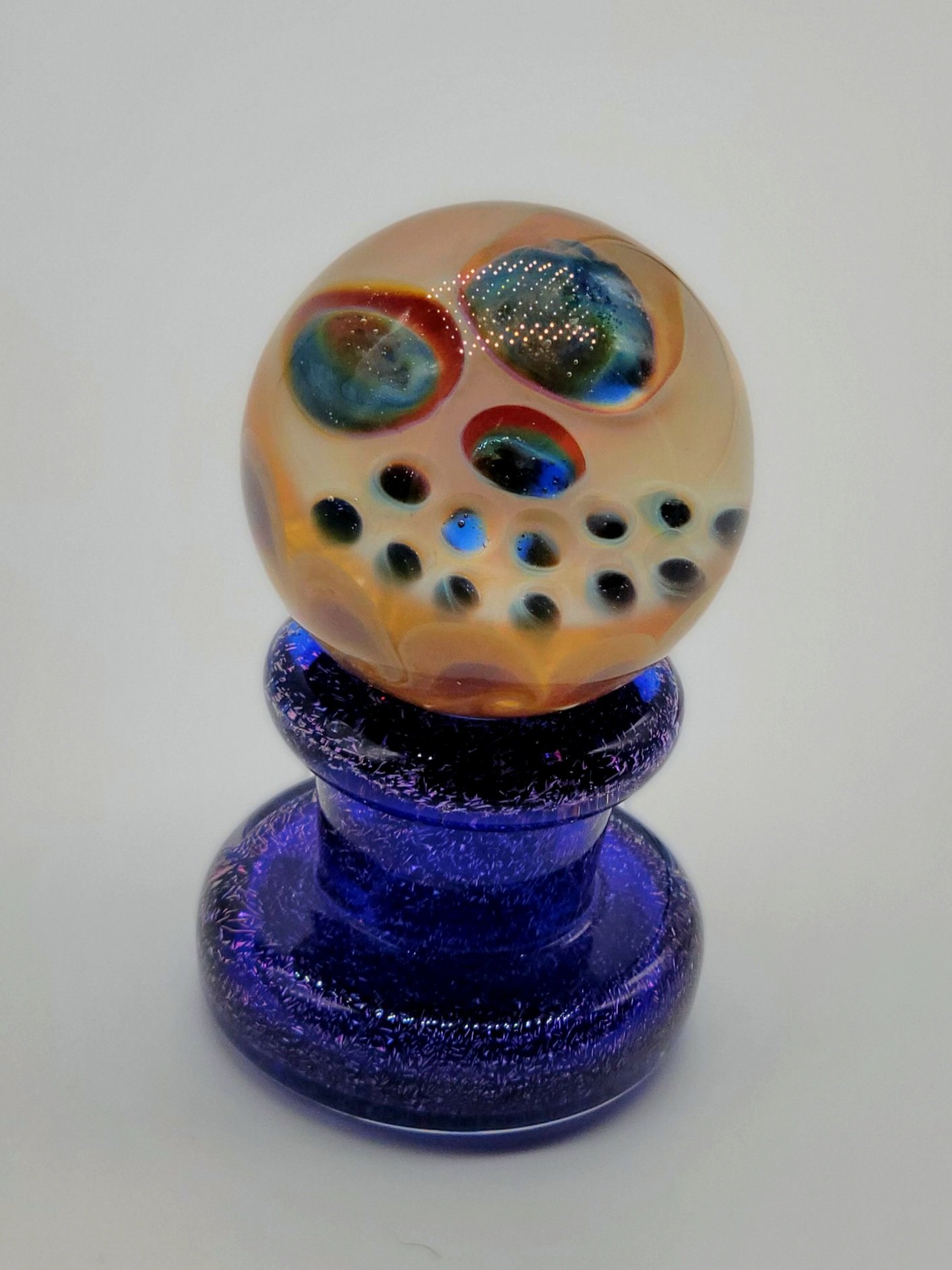 ๐ Ghostface/Skull ๐ฑ Marble #02 features a ghostface with little planet earths ๐ for eyes! You can get lost staring into this little dudes fumed out face : ) The backing of this marble features a new pinwheel technique that works well to show off this marbles front showing silver fumed face. Marble is approximately 1 ยน/2 inches in size.