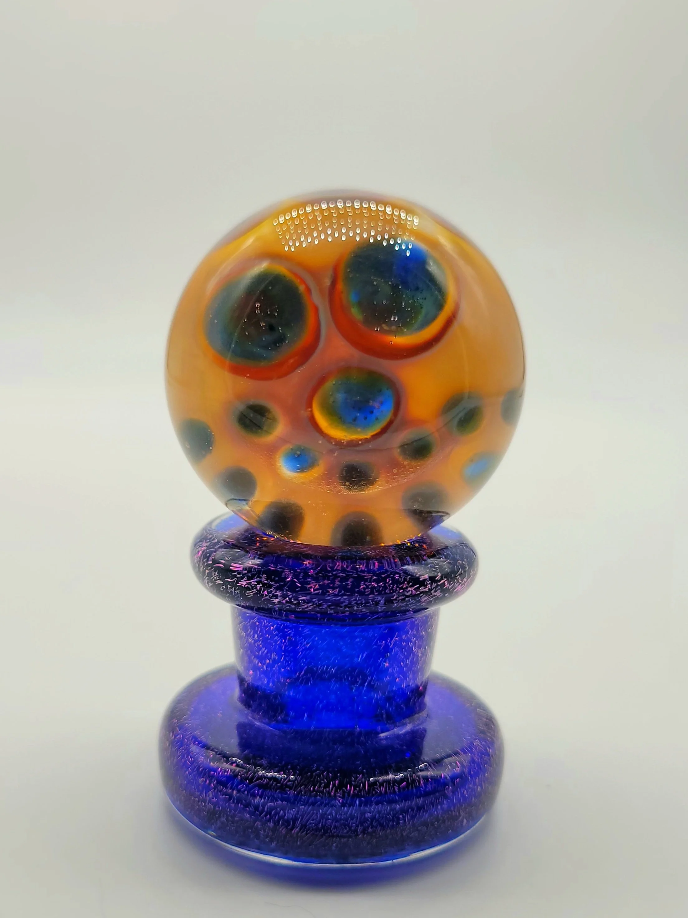 Baller Jar- #02 Features blue and purple dichroic glass tubing made by the one and only @__sleeps__ Cork included. This jar/marble stand sits just under 1 ยน/2 inches tall.
